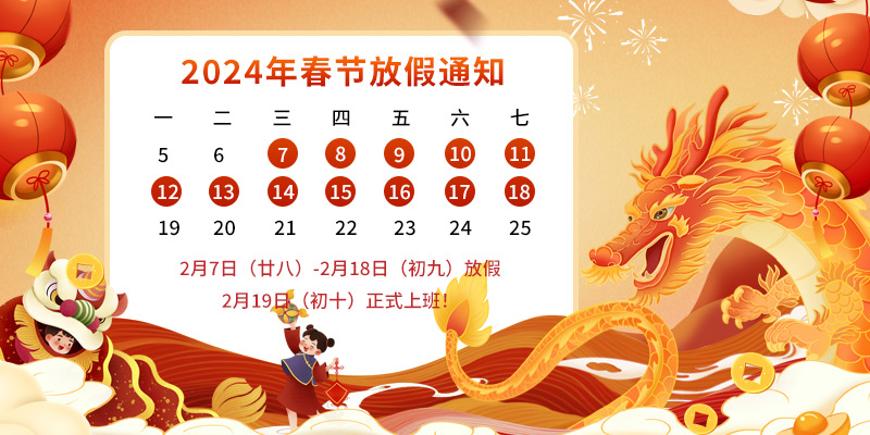 一、放假時(shí)間:2024年2月7日(農(nóng)歷臘月廿八)----2024年2月18日(農(nóng)歷正月初九)放假,2024年2月19日(農(nóng)歷正月初十)正式上班。